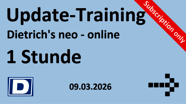 Entdecken Sie die neue Art zu arbeiten mit Dietrich’s neo. Erleben Sie als Subscription-Kunde exklusiv die neue Oberfläche, den neuen Workflow und die KI-Unterstützung direkt im Programm. Datum: 09.03.2026