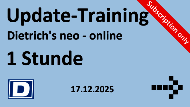 Entdecken Sie die neue Art zu arbeiten mit Dietrich’s neo. Erleben Sie als Subscription-Kunde exklusiv die neue Oberfläche, den neuen Workflow und die KI-Unterstützung direkt im Programm. Datum: 17.12.2025