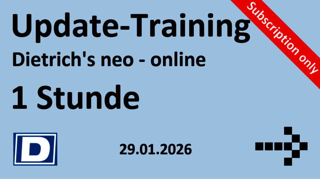 Entdecken Sie die neue Art zu arbeiten mit Dietrich’s neo. Erleben Sie als Subscription-Kunde exklusiv die neue Oberfläche, den neuen Workflow und die KI-Unterstützung direkt im Programm. Datum: 29.01.2026