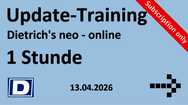 Entdecken Sie die neue Art zu arbeiten mit Dietrich’s neo. Erleben Sie als Subscription-Kunde exklusiv die neue Oberfläche, den neuen Workflow und die KI-Unterstützung direkt im Programm. Datum: 13.04.2026